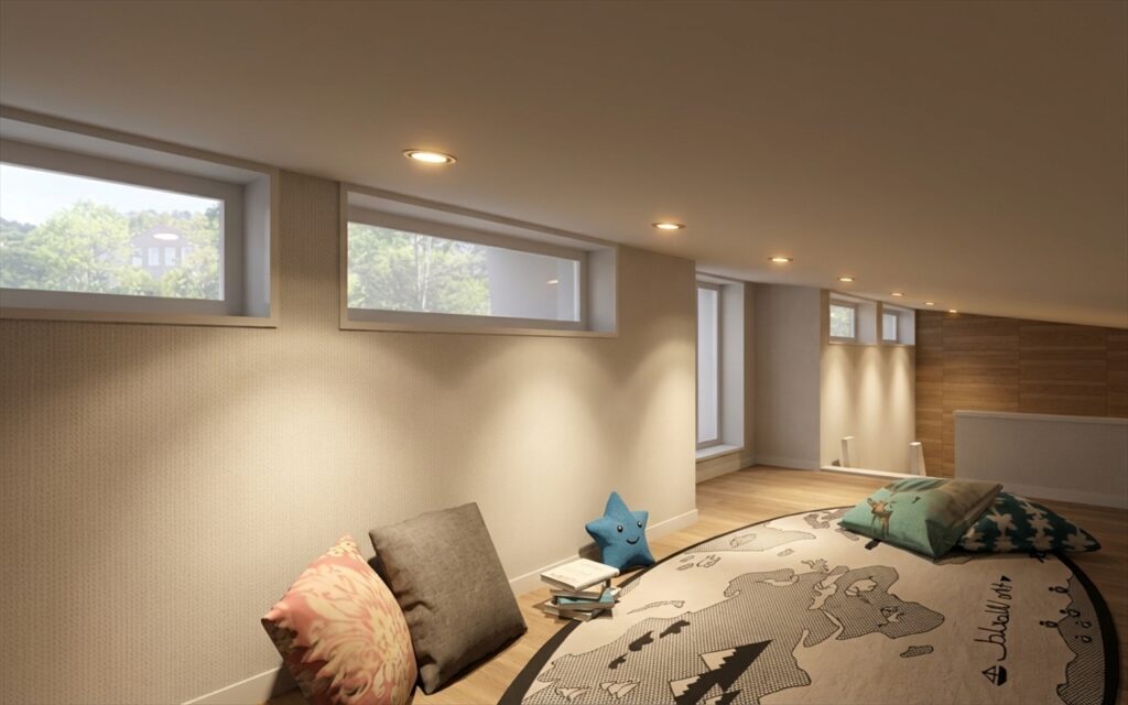 魔法瓶のような外周壁の高気密断熱で、間取りを仕切る壁や戸がなくても、家全体が包まれて夏涼しく冬暖かいので、子育て世帯・小世帯の変化にも柔軟に対応できます。子育て世代ではLDKを広くして一緒にすごせ、成長後に個室化してプライベート空間に切り換えられます。
